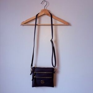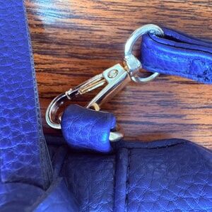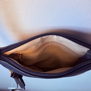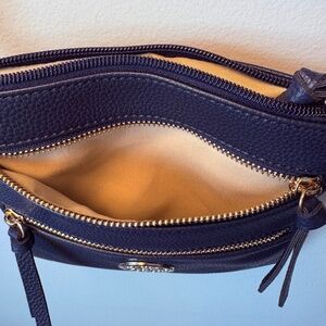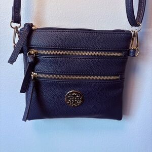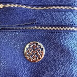 Beautiful navy color with gold accent zippers and medallion. Buttery soft to the touch, light weight with zipper fasteners. Medium size multi compartment purse. Features two front zip pockets and one back zip pocket to better organize all your essentials. Adjustable shoulder strap.