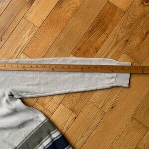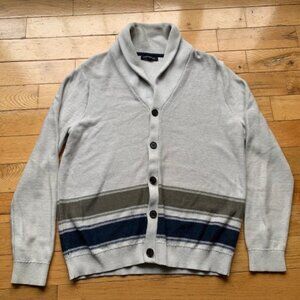 Classic Banana Republic cardigan in a soft neutral grey with navy and olive striped detail at the hem. Features a shawl collar, button front, and ribbed cuffs and hem for a timeless, versatile look. Easy to dress up or down — perfect for office, casual wear, or layering in cooler months.