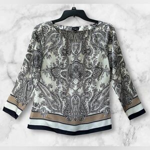 Talbots Silky Black White Tan Paisley Boho Floral Print Blouse Top Size 2P