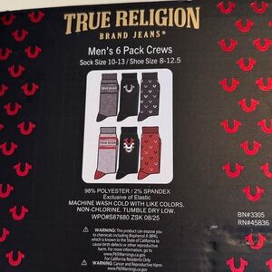 True Religion 6-Pack Crew Socks in blue, grey, burgundy and black with silver threads for shoe size 8-12.5 NWT