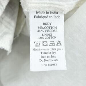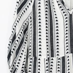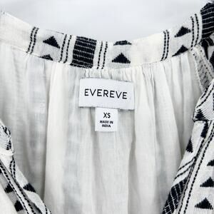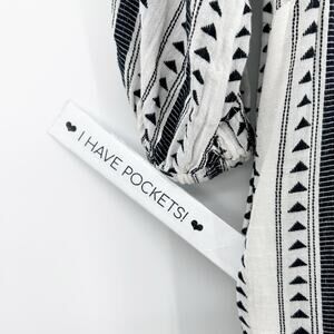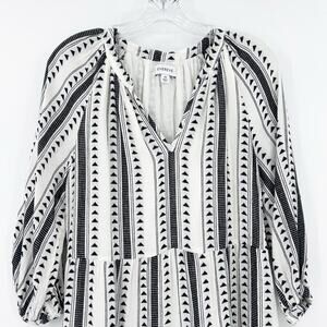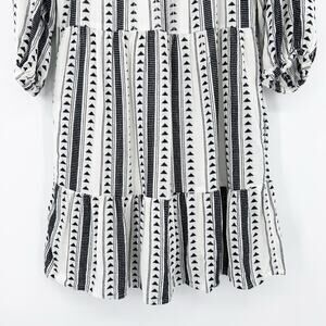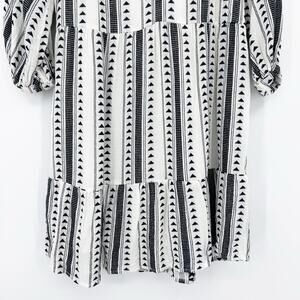 Evereve Carolina womens dress in black and ivory. Crafted in a lightweight cotton- blend, the dress features a black geometric triangle/Aztec stripe pattern over a creamy ivory ground, three-quarter puff sleeves with elastic cuffs, an easy V-neckline, an empire seam waist, and a tiered skirt that gives a flirty flow. Side pockets add a practical touch. Size XS. Excellent used condition. No flaws detected. See measurements for proper fit.