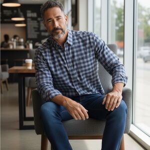 Navy checkered shirt with button-down design. Ideal for casual outings. Crafted by Ted Baker London. New without tags