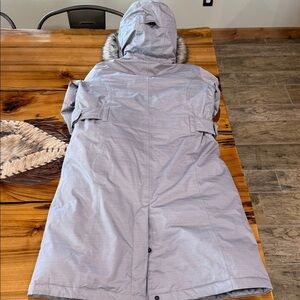 Warm coat with a plush hood. Features faux fur trim (removable)for added style. This coat is very warm and stylish. It may be down but Eddie Bauer thought of style as well with all of the extra belting at waist and chic (button) slit in the back. No stains…it is in pristine condition.
