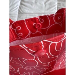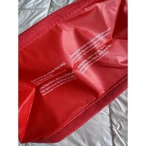 The product is a new Lululemon 2025 small red and white repeat logo reusable shopping bag. Made of nylon and plastic materials, it features a foldable design and measures 9.5 inches in length, 12 inches in height, and 4.5 inches in width. The multicolor bag with the iconic Lululemon logo is perfect for carrying small items while shopping, offering a convenient and eco-friendly solution for household supplies.