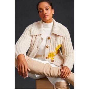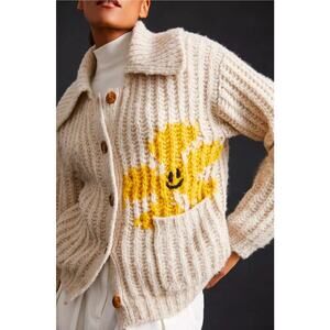 Gorgeous, fun, cardigan by Pilcro. Pockets in the front, soft and cozy. Oat color with a smiley yellow flower. In good pre-loved condition. Measurements are approximate and shown in pics. Retailed for $248
