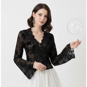 Features: Flared trumpet sleeves, sheer floral burnout pattern, scalloped lace detailing, and button-front closure.