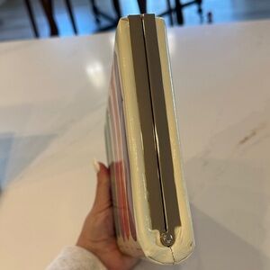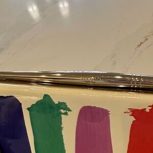 Stylish clutch with bold brushstroke design. Features purple, green, pink, and red accents.