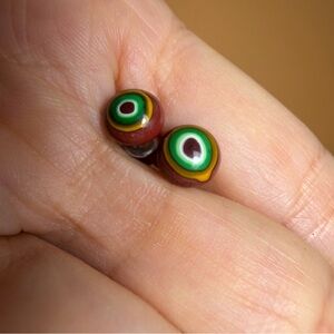 Add a pop of color to your look with these unique stud earrings. They feature a vibrant, multi-layered design that looks a bit like the classic evil eye symbol. The brown, green, and yellow tones make them a standout accessory. They come with backings included and are ready to wear.