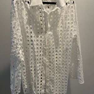 Stay stylish at the beach with this elegant white eyelet swim cover-up. Perfect for adding a touch of sophistication to your swimwear ensemble.