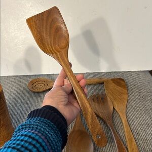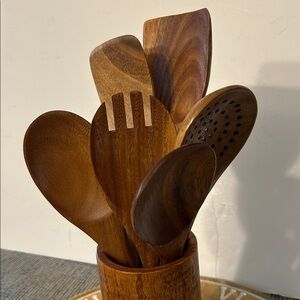 Wooden Utensil Set with Holder 6 pcs spoon spatula fork piece (salad server?)
