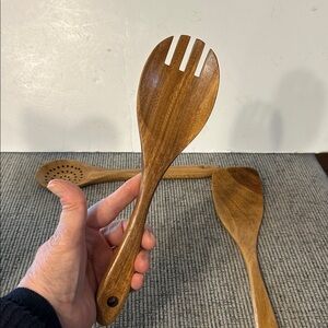 Enhance your kitchen with this elegant wooden utensil set. The rich brown color adds a natural touch to your dining experience. Perfect for cooking and serving.