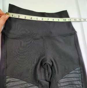 Alo yoga moto leggings high waist compression activewear in black women size XS, full stretch, has mesh, 28 inch inseam, 36 inch length, 22 inch waist, pullover, visible pilling in the crotch outer part please look at the photographs well garment washed in good condition to wear.