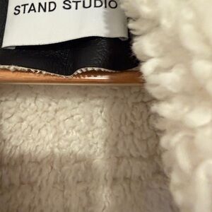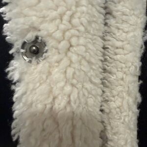 Chic black jacket with cream teddy accents. Cozy and fashionable. Ideal for cool weather.