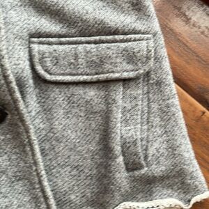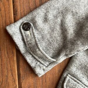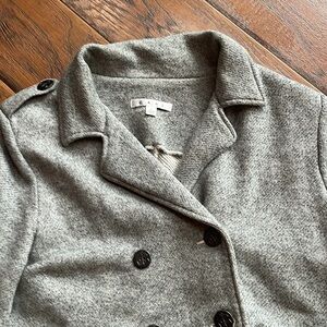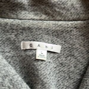 Cabi gray jacket, Size Large, double breasted, 3/4 sleeveses, collared, lining shown in pic, two bottom front flap top on pockets, armpit to armpit approximately 21” across, approximately 23” long, lightly worn