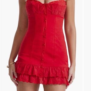 Chic red mini dress with lace details. Features button front and ruffled hem. Perfect for a night out.