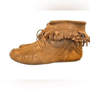 Stylish moccasin ankle boots with fringe detail. Soft suede material. Ideal for casual wear. In good condition but there is some light wear towards bottom near sole as shown in pictures. Size 8.5