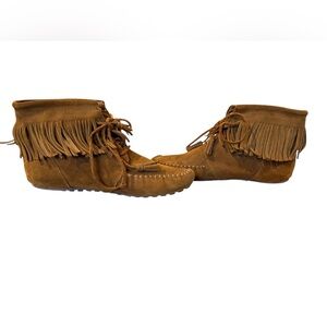 Minnetonka Suede Leather Tan Fringe Moccasin Boots Shoe or Slipper 8.5