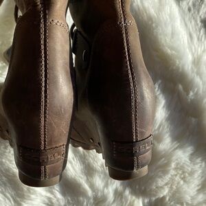 Chic tan wedge boots with lace-up design. Features buckle accents for added style.