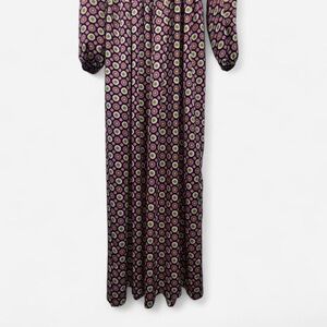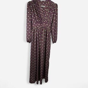 Beautiful retro-print long-sleeve maxi dress with tie waist and draped front. No size or brand label—please check measurements to ensure fit. Lightweight and flowy.