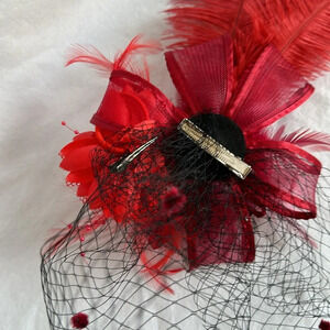 Large red feathers, ribbon, and netting fascinator. Good preowned condition. The red portion totals about 14”. The feathers alone are about 10”. Great for the Kentucky Derby, costume parties, royal events, Halloween, or other occasions!