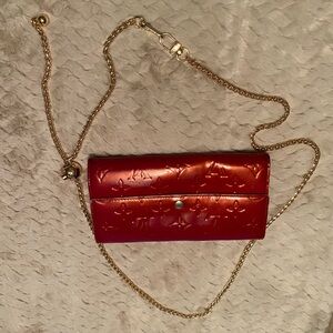 Chic Louis Vuitton wallet in cherry red. Embossed monogram design. Adds luxury to any ensemble.