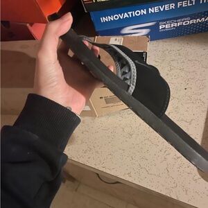 Comfortable Nike flip-flops. Sleek black design with gray accents. Perfect for casual wear.