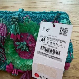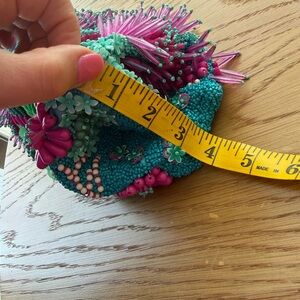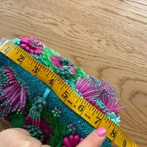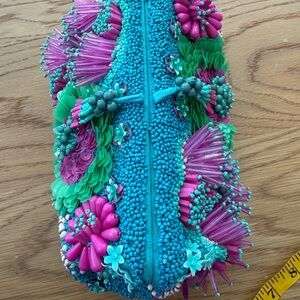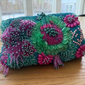 Make a statement with this vibrant beaded clutch. Featuring a stunning mix of turquoise and magenta, this bag is perfect for adding a pop of color to any outfit.