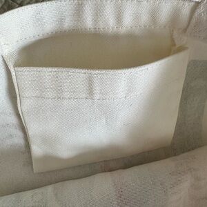 Chic canvas tote by Kate Spade. Features bold blue text on a white background.