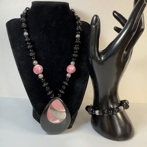 Striking beaded necklace and matching bracelet set featuring glossy black stone beads with pink accent beads and a large teardrop pendant. The stone tests in the nephrite range on a Presidium tester, but exact stone type is unconfirmed and priced accordingly.