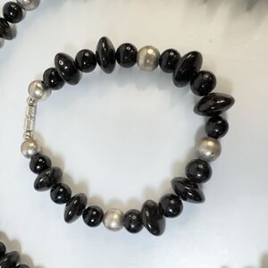 Black Stone Beaded Necklace w Teardrop Pendant & Matching Bracelet Set 18"
