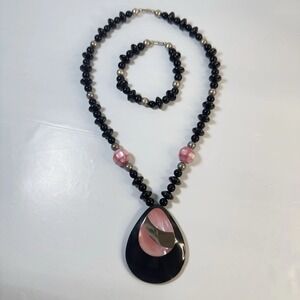Black Stone Beaded Necklace MOP Teardrop Pendant & Matching Bracelet Set 18"