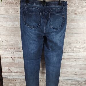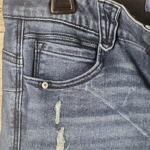 Democracy, 0367, Stylish indigo skinny jeans with subtle distressing. Ideal for everyday wear. Frayed hemline. Length 36", Inseam 27", waist 32", Comfortable fit.