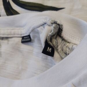 White t-shirt featuring a subtle tropical leaf design. Ideal for everyday style.