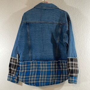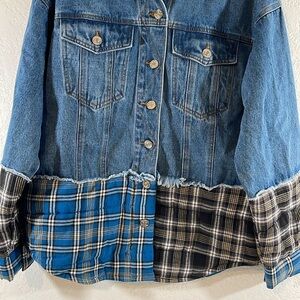Stylish denim jacket with plaid patchwork. Button-up front. Unique design for a trendy look.