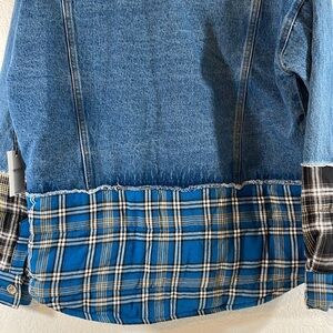 Classic light denim jean jacket with quilted flannel designed bottom half of jacket and sleeves.