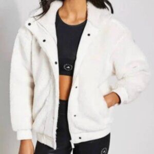 Gorgeous, ultra-cozy Alo sherpa jacket in a soft ivory tone. The perfect oversized, plush zip-up for layering, lounging, or throwing on to and from your workout. Features ribbed cuffs + hem, side pockets, high-neck collar, and signature Alo arm patch. Gently worn, no tags. Clean, soft, and in great pre-loved condition with tons of life left.