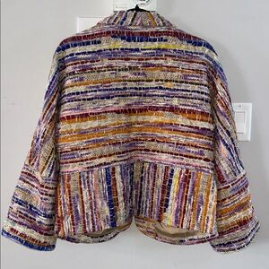 A serape-inspired cropped jacket boasts a full-spectrum sunset of stripes, and open front and a shawl collar that morphs into handy front pockets.