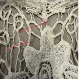 Daytrip layered tank dress showcasing a playful mix of textures and colors. This sleeveless piece features a striped bodice with a button-up placket and contrasting orange stitching. Delicate crochet lace detailing adorns the neckline and waist. The skirt is designed in tiers of bright yellow and aqua blue, with the bottom tier featuring a subtle textured pattern. A beautiful crochet overlay graces the back, adding an intricate bohemian touch. It does have a couple of red spots on the crochet piece in the back. You don't really notice it, but it is shown in the pictures.