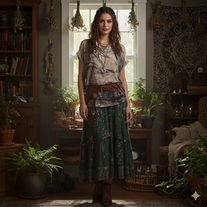 Reproduction style dress just like one worn by Willow in the TV show Buffy the Vampire slayer! Like new condition. Bell sleeves and side slits on skirt. Soft stretch velour velvet with zodiac celestial print. Measurements are in inches: bust 34-38, waist 27-34, hips 35-41, length 55, shoulders 15.5-18, sleeves 25.5