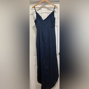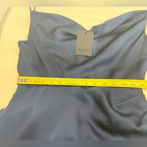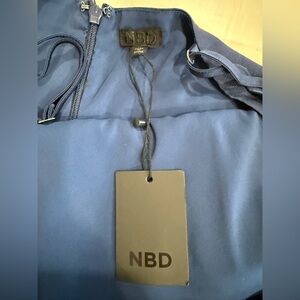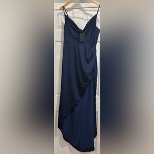 Chic asymmetrical dress by NBD. Features a sleek navy hue. Perfect for evening events.