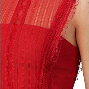 Red lace bodice with mesh overlay (88% Polyamide, 12% Elastane). Hourglass. Sleeveless. Crew neckline. Hidden back zipper closure. Fully Lined. 36" from shoulder to hemline.