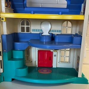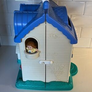 This nostalgic toy is part of the Fisher-Price Little People collection. White plastic house with blue roof and green grass base. Front door opens and closes and has a working doorbell. Back of house has a red door that opens and closes, and an attached doghouse. Inside is a kitchen (refrigerator door opens/closes), bedroom, living room, bathroom (toilet seat opens/closes), attic playroom.