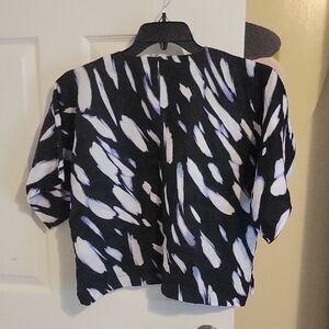 Stylish DKNY crop Linen top with a dynamic black, white, purple pattern. Perfect for modern styling. 22" pit to pit and 22" length. H42
