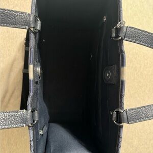 Elegant Coach tote with navy signature pattern. Black leather trim and handles. Perfect for everyday use.