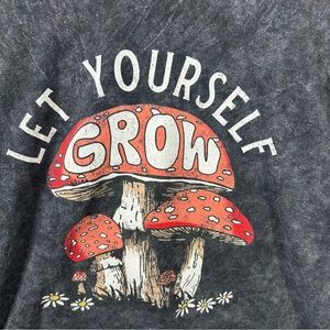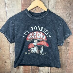 • Special Details: Black acid wash cotton tee, “Let Yourself Grow” mushroom graphic on front, coordinating mushroom and daisy print on back, rolled sleeve hems, slightly cropped silhouette, soft worn-in feel, nature-inspired whimsical artwork