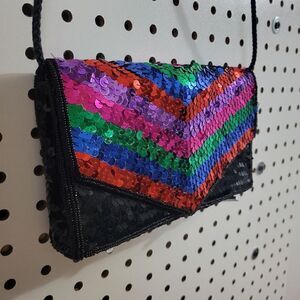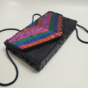 Great sequined colorful party bag with black microbeading trim, envelope flap front closure with magnetic clasp, black satin rope strap, clean black lining. Excellent preloved condition, like new.