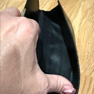 This is a chic Gucci wallet with embossed logo design. Sleek black leather with gold-tone accent. Ideal for stylish organization.