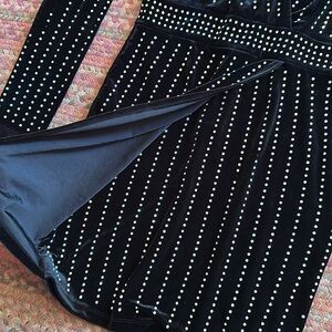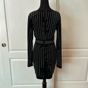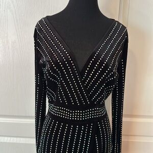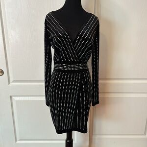 WINDSOR BLACK VELVET STUDDED V NECK WRAP LONG SLEEVE DRESS