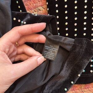 GUC. There’s a small pin hole as pictured & Some of the studs are missing but not super noticeable. Zip back closure. Nice stretch. Faux wrap front.