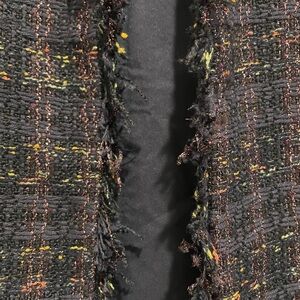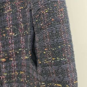 Sleeveless open-front jacket featuring a navy blue tweed fabric interwoven with multicolored fibers like pink, purple, green and yellow and has metallic shimmer.